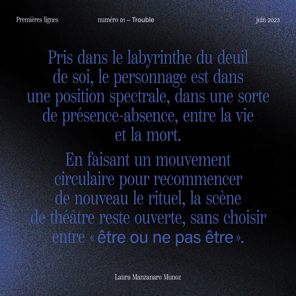 Pris dans le labyrinthe du deuil de soi, le personnage est dans une position spectrale, dans une sorte de présence-absence, entre la vie et la mort. En faisant un mouvement circulaire pour recommencer de nouveau le rituel, la scène de théâtre reste ouverte, sans choisir entre « être ou ne pas être ».