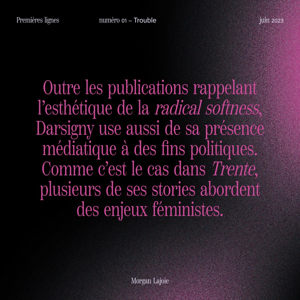 Outre les publications rappelant l’esthétique de la radical softness, Darsigny use aussi de sa présence médiatique à des fins politiques. Comme c’est le cas dans Trente, plusieurs de ses stories abordent des enjeux féministes. Enfin, le partage de memes en stories Instagram, où l’actrice Angelina Jolie est régulièrement convoquée (tout autant que dans ses publications Twitter et Instagram), fait également écho aux figures que nous retrouvons dans Trente. Parmi ces memes, certains adressent aussi la sobriété de l’autrice avec une touche d’humour propre au format.