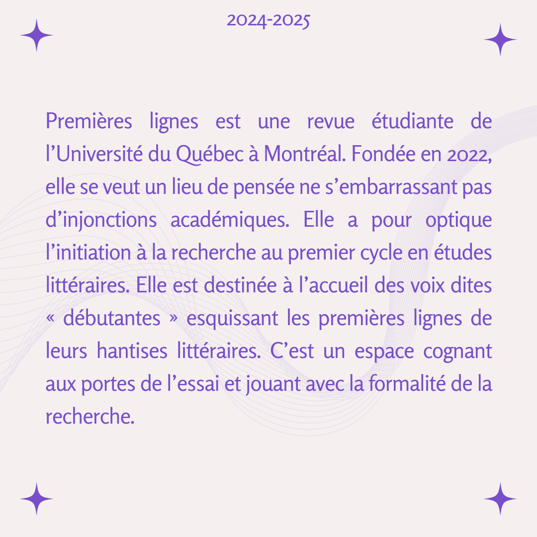 Si tu souhaites t’impliquer dans une revue étudiante qui a pour objectif l’initiation des étudiant.e.s du premier cycle à la recherche en études littéraires, tu as jusqu’au 21 septembre prochain pour envoyer ta candidature à info@revuepremiereslignes.ca !