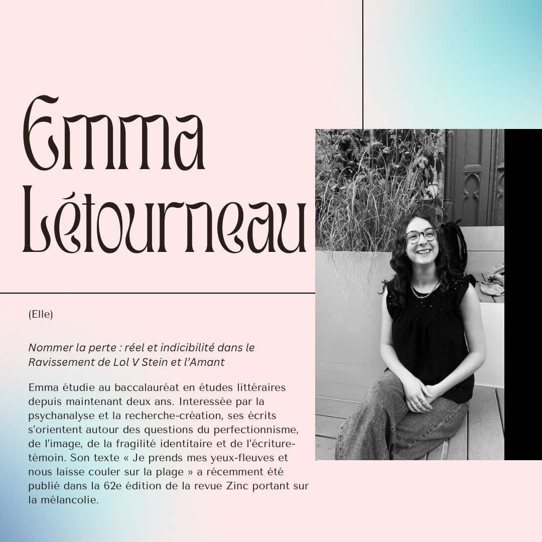 Emma étudie au baccalauréat en études littéraires depuis maintenant deux ans. Intéressée par la psychanalyse et la recherche-création, ses écrits s’orientent autour des questions du perfectionnisme, de l’image, de la fragilité identitaire et de l’écriture-témoin. Son texte « Je prends mes yeux-fleuves et nous laisse couler sur les pages » a récemment été publié dans la 62e édition de la revue Zinc portant sur la mélancolie.