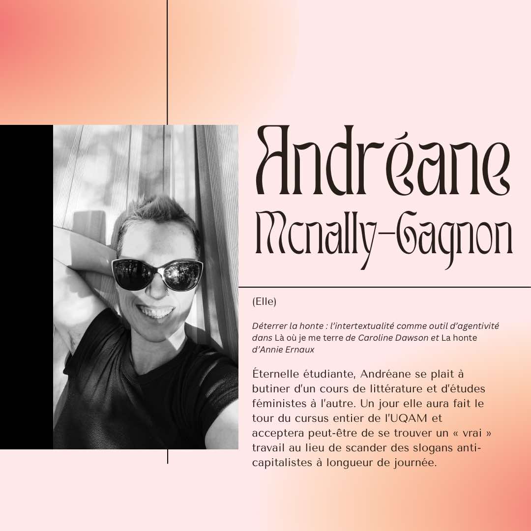 Éternelle étudiante, Andréane se plait à butiner d’un cours de littérature et d’études féministes à l’autre. Un jour elle aura fait le tour du cursus entier de l’UQAM et acceptera peut-être de se trouver un « vrai » travail au lieu de scander des slogans anti-capitalistes à longueur de journée.