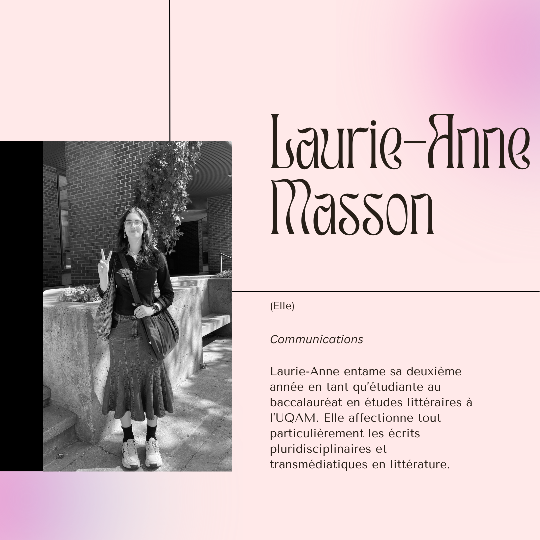 Laurie-Anne entame sa deuxième année en tant qu’étudiante au baccalauréat en études littéraires à l’UQAM. Elle affectionne tout particulièrement les écrits pluridisciplinaires et transmédiatiques en littérature.