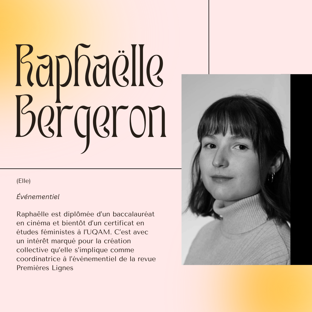 Raphaëlle est diplômée d’un baccalauréat en cinéma et bientôt d’un certificat en études féministes à l’UQAM. C’est avec un intérêt marqué pour la création collective qu’elle s’implique comme coordinatrice à l’événementiel de la revue Premières Lignes