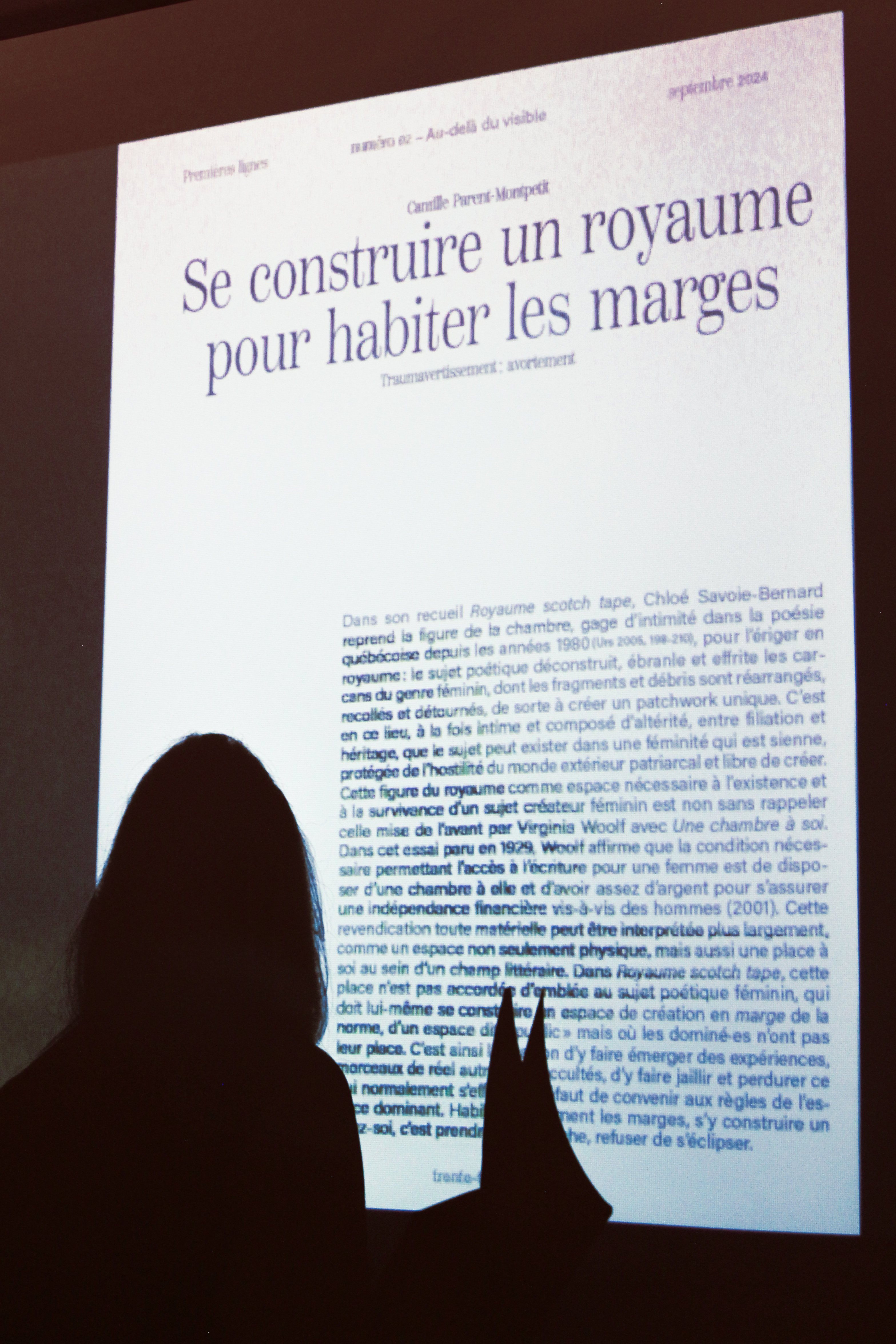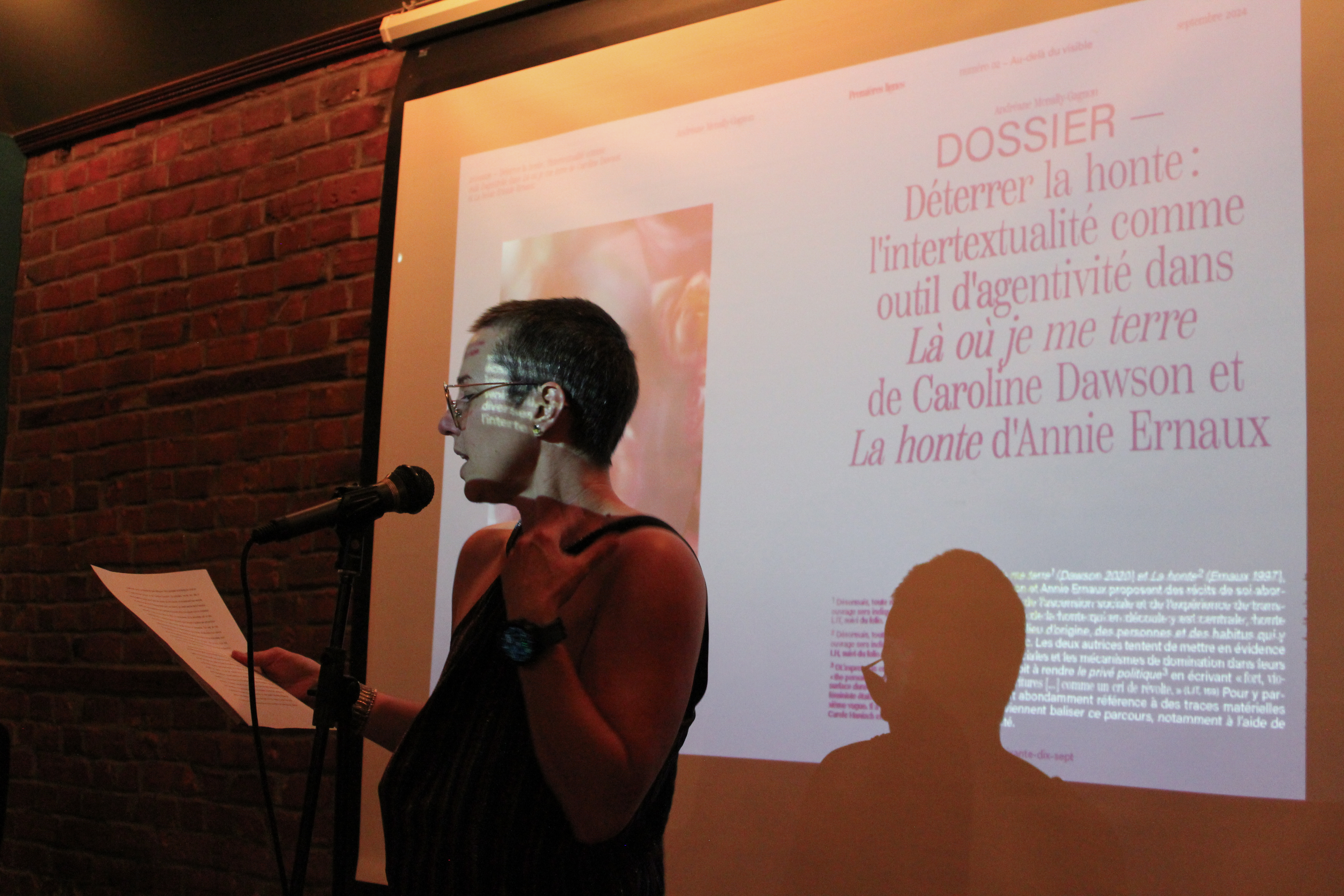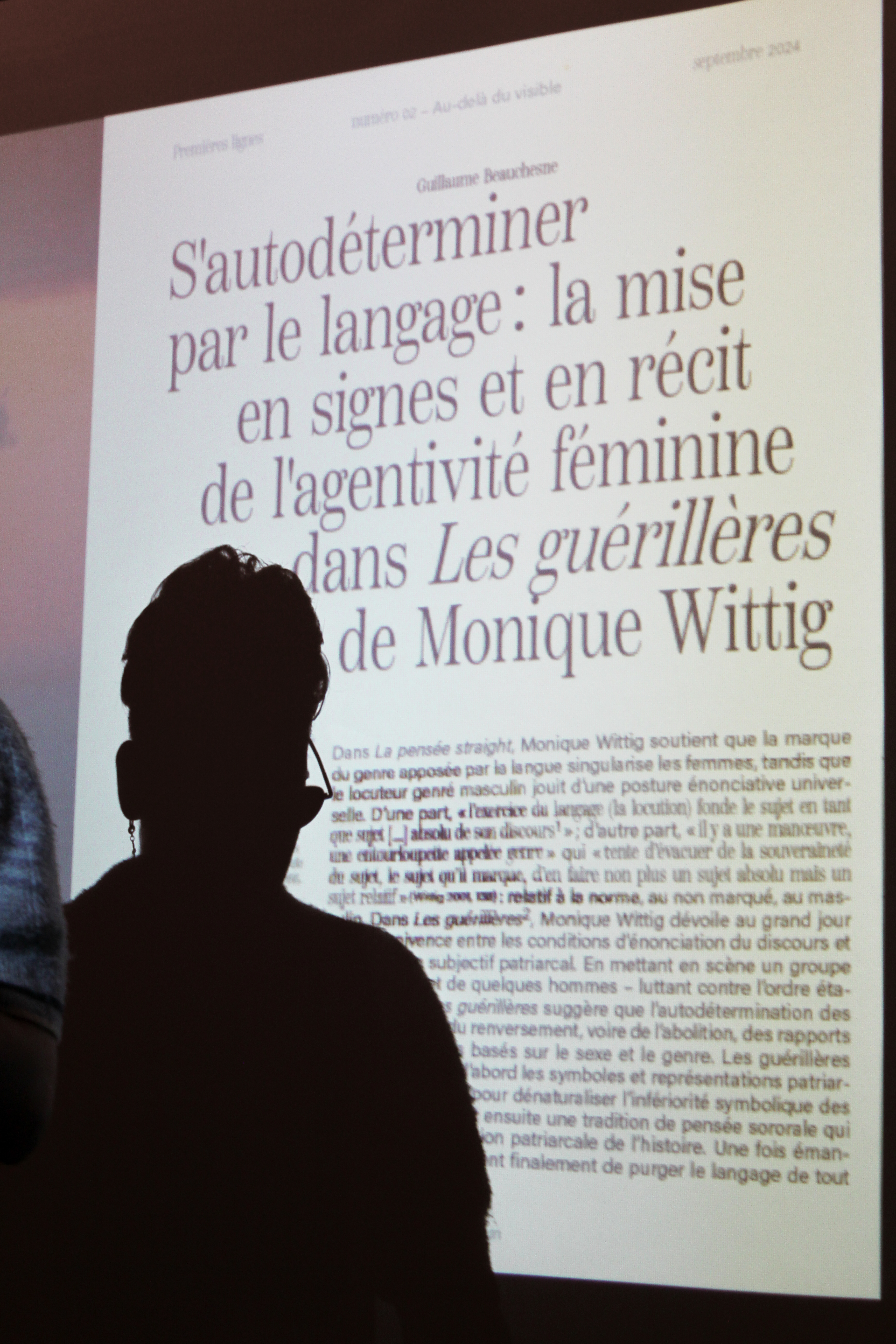 Le 13 septembre dernier eut lieu le lancement de la seconde parution de Premières lignes, « Au-delà du visible ». Merci encore à celleux qui, en contribuant de près ou de loin au projet, ont permis au numéro d’être un tel succès. Nous sommes enthousiastes à l’idée de voir ce projet évoluer dans le temps, d’équipe en équipe, de cohorte en cohorte, avec comme objectif toujours inchangé d’offrir un espace d’expérimentation et de formation aux voix dites débutantes dans le domaine de la recherche en études littéraires.