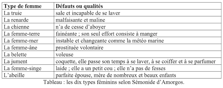 Si l’on prend un pas de recul, on peut constater que les femmes sorcières sont associées à la nature dès l’Antiquité gréco-romaine, une époque où le genre féminin presque dans son ensemble est souvent représenté comme une calamité, tel que l’explique Christian-Georges Schwentzel, un historien et professeur d’histoire ancienne à l’Université de Lorraine8. Schwentzel revient sur la classification de la femme en dix catégories, dont huit sont des animaux et deux des éléments naturels, établies par le poète grec Sémonide d’Amorgos, comme on peut le voir dans le tableau suivant9 :